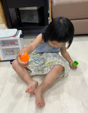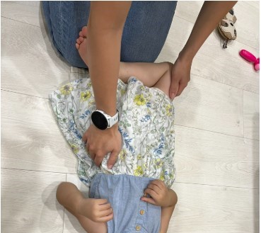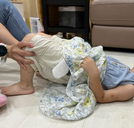 請孩子坐地,髖關節外展,雙腳相對,兩腳同時向前移動,屁股再跟著向前,可促進孩子習慣以髖外轉的姿勢出力。可配合情境任務例如: 屁股走路到2公尺遠處找出指定玩具再拿回來。每次執行5-10分鐘。