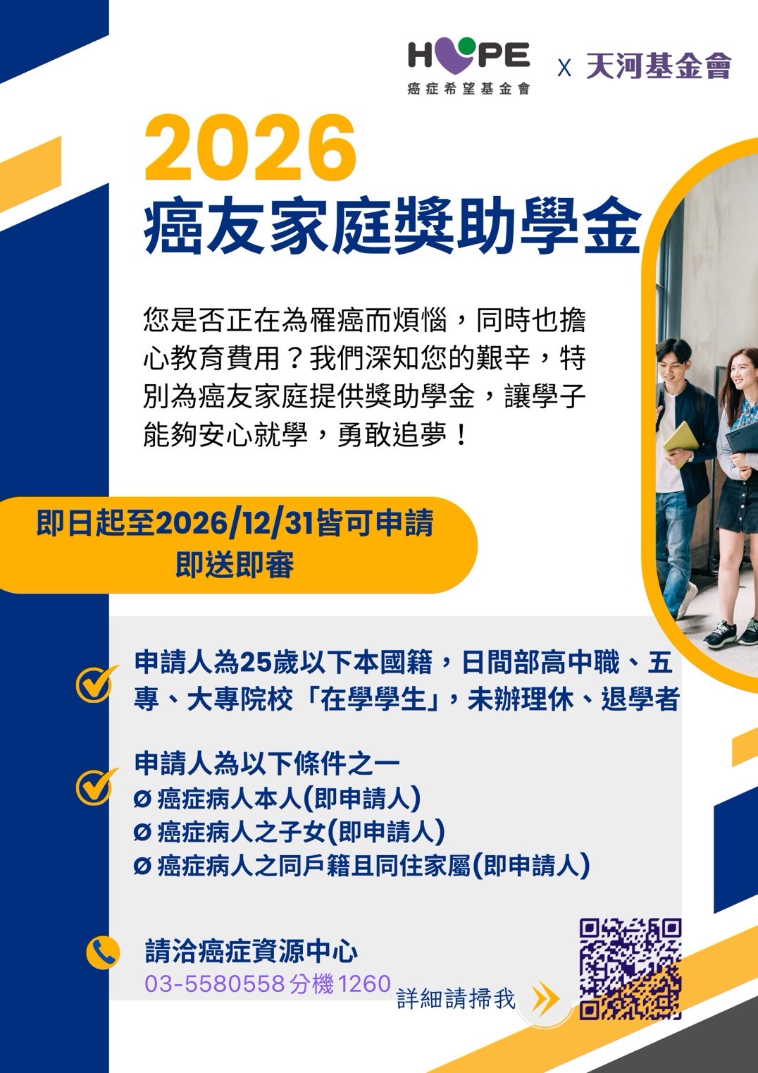 天河基金會癌友學子獎助學金申請