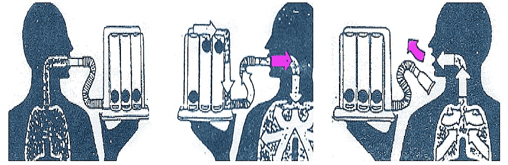 - 將吸嘴含在口中,以平穩的速度吸氣,吸入足夠的氣流讓第 1 顆球升到頂,而第 2 顆球還沒動,此時請加強您的吸氣流速繼續吸氣,直到 3 顆球全部升起,吸飽後閉住氣約 3 秒鐘。