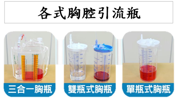 - 請勿自行拔除胸腔引流管與引流瓶之接合處、傾斜引流瓶或擅自開啟引流瓶蓋倒出引流液、或將引流管夾住等危險行為,以免造成危及性命之後果。