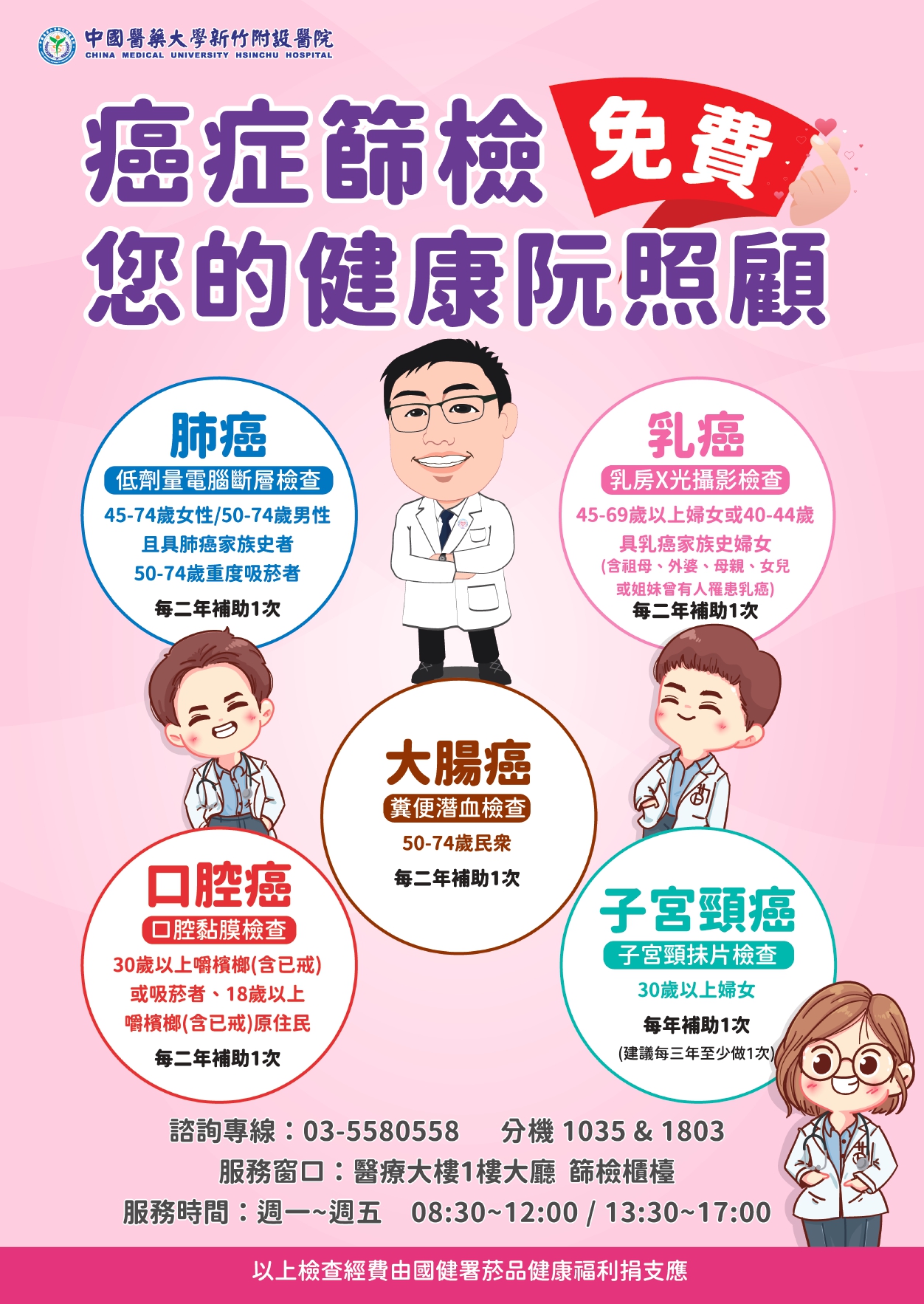 2025/7/1五癌篩檢包括:子宮頸癌、乳癌、大腸癌、口腔癌、肺癌